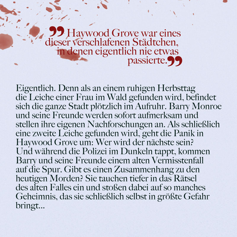 Im Herbst 2021 ist es soweit: mit „Die Toten von Haywood Grove“ erscheint mein erster Kriminalroman! Es ist der erste Fall für meinen neuen Helden Barry Monroe, der in einer fiktiven US-amerikanischen Kleinstadt lebt und dort auf Mörderjagd geht. Den Krimi kann man durchaus auch noch in der Young Adult Schiene verorten.